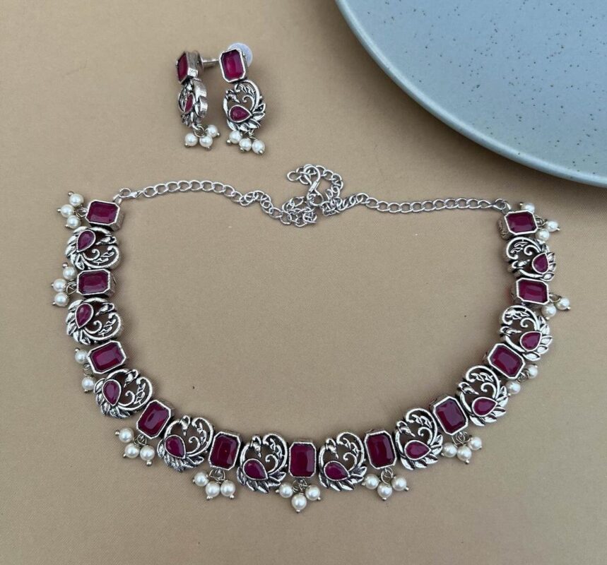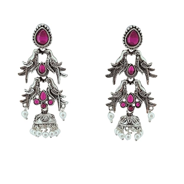 Nimaya Traditional Oxidised Bird Motif Earrings with Pink Stones & Pearl Jhumka Drops for Women & Girls