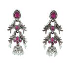Nimaya Traditional Oxidised Bird Motif Earrings with Pink Stones & Pearl Jhumka Drops for Women & Girls