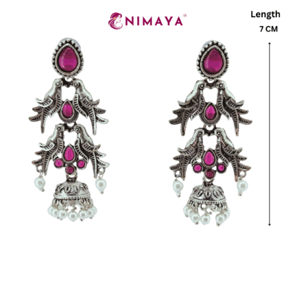 A bold fusion of vintage charm and modern elegance, this oxidized silver necklace set features deep ruby-red stones and delicate pearl drops, perfect for elevating any ethnic look.